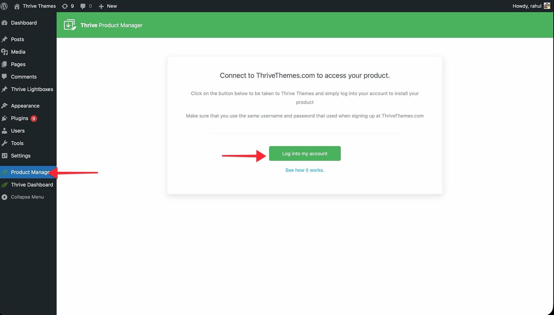- Open the Product Manager from the left sidebar and log in with your Thrive Themes account credentials to connect it.