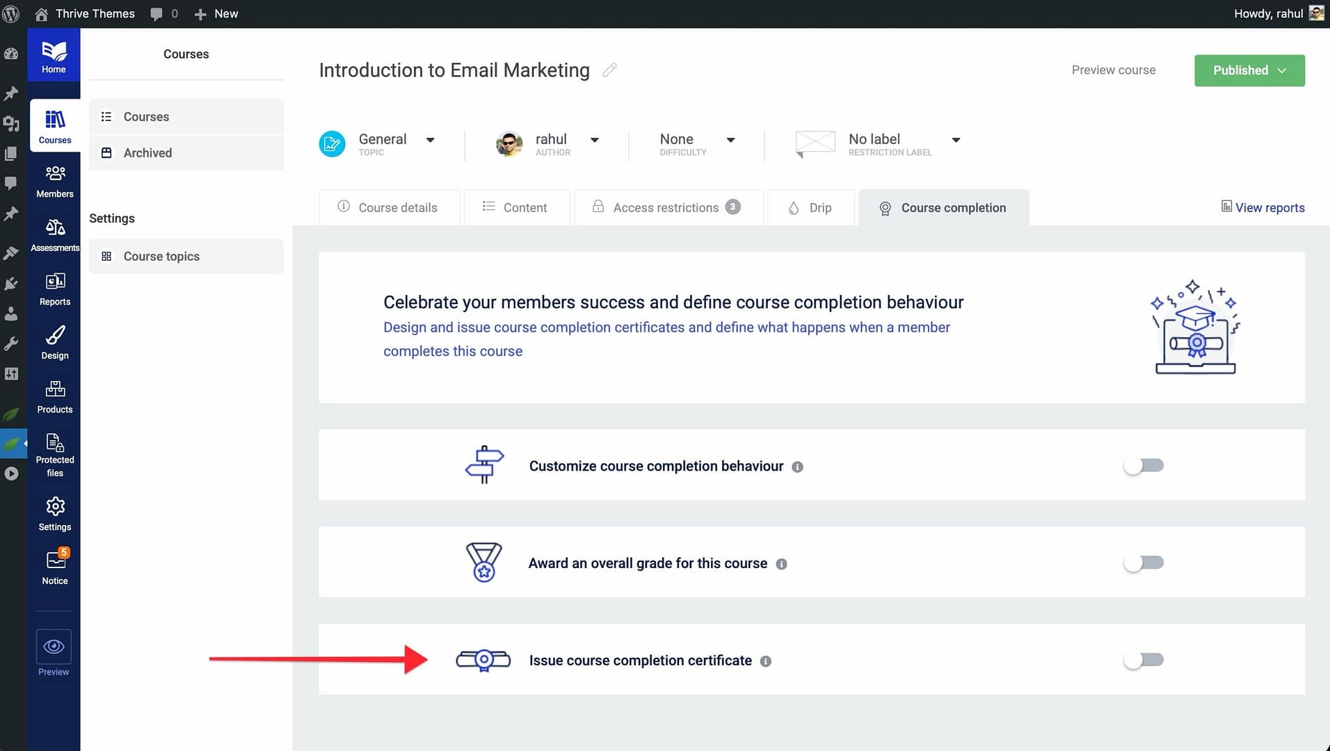 Certificates are managed on a per-course basis from the Course completion tab. Here’s how to enable them: