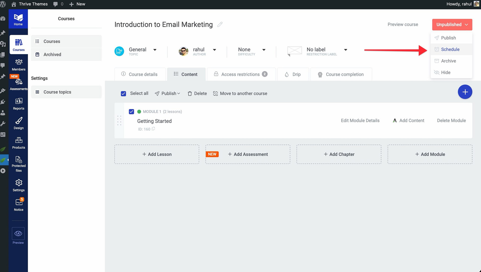 1. Navigate to Thrive Dashboard > Thrive Apprentice and open the course you want to schedule.
