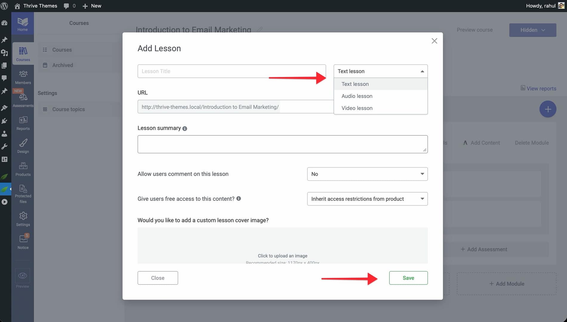 - Enter the lesson name and configure the lesson type (Text, Video, or Audio).