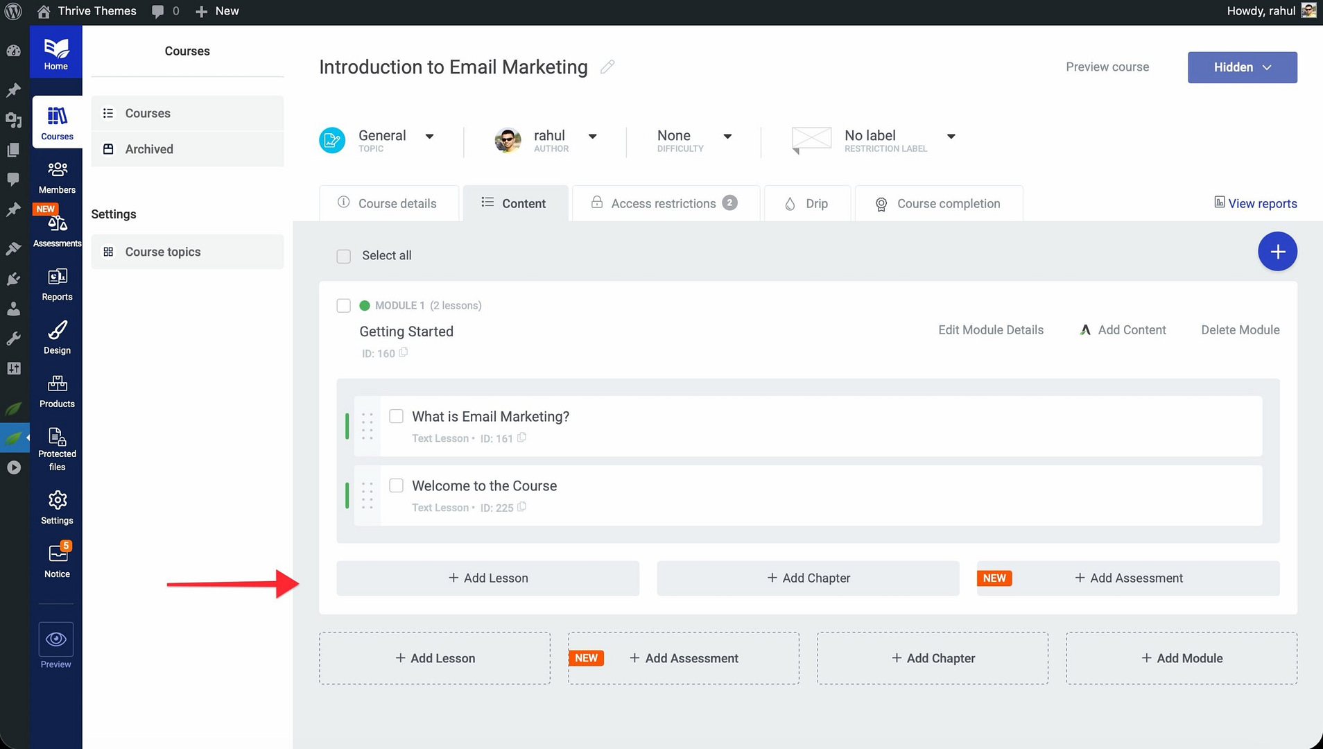 The hierarchy works like this: Course > Module > Chapter > Lesson. You don’t have to use all levels—if your course is simple, you can skip modules and organize lessons directly into chapters, or skip chapters entirely and place lessons directly inside modules.