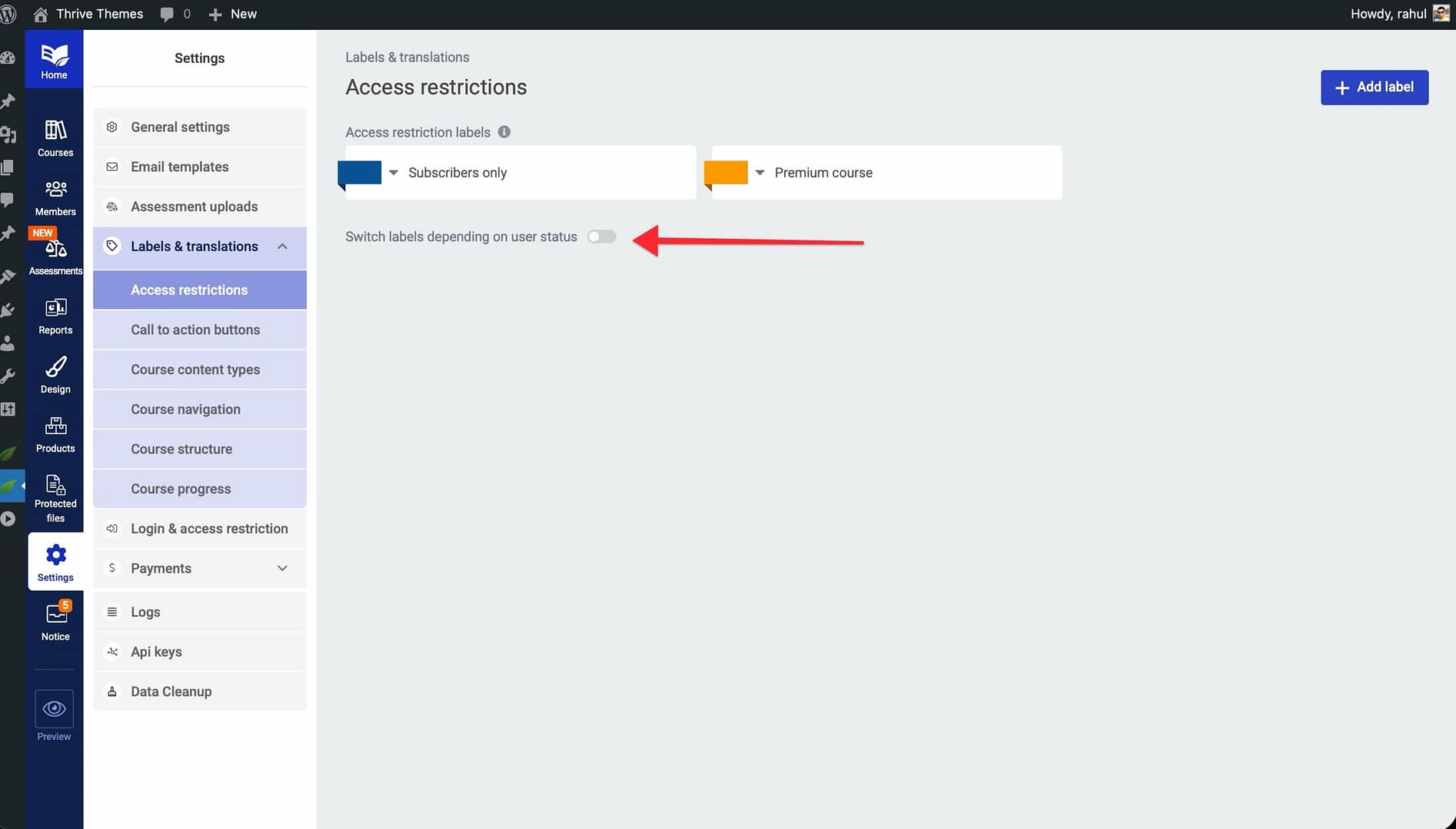 When the switch toggle is off, each course simply displays whatever label you assigned to it. When it’s on, logged-in users with access see a progress-based label instead of the base label, while visitors without access still see the original assigned label.