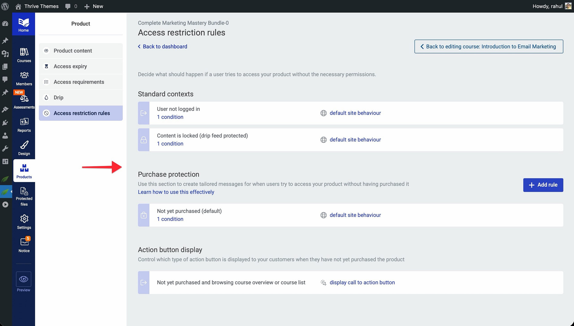 Important: When a course belongs to multiple products, Thrive Apprentice evaluates the visitor’s context—such as the referral link or the page they came from—to determine which product’s rules to display. If the context is ambiguous, the first matching product’s rules take effect.