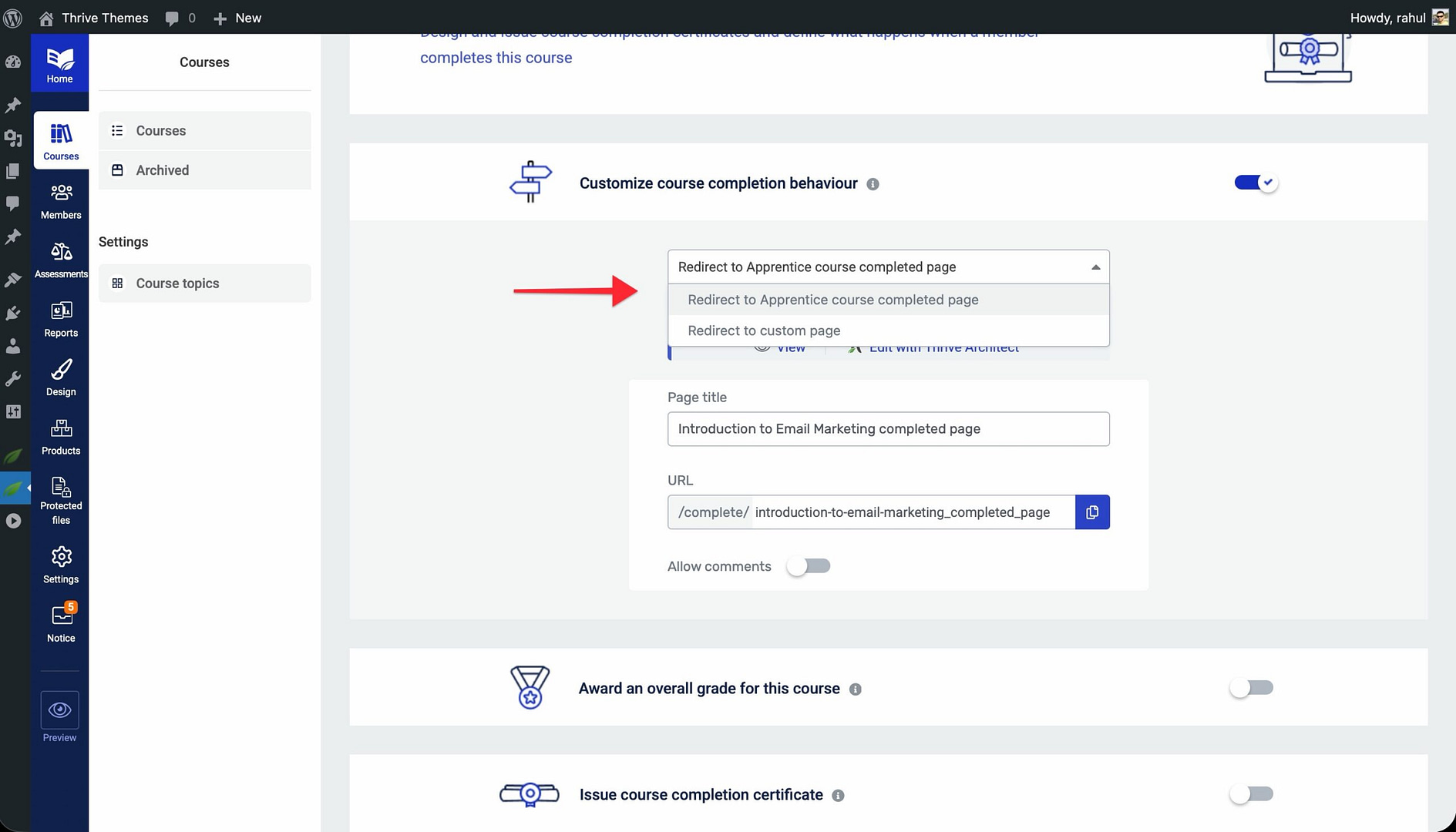 Redirect to Apprentice course completed page — sends the student to a dedicated completion page that Thrive Apprentice creates automatically for the course. This is the default option.