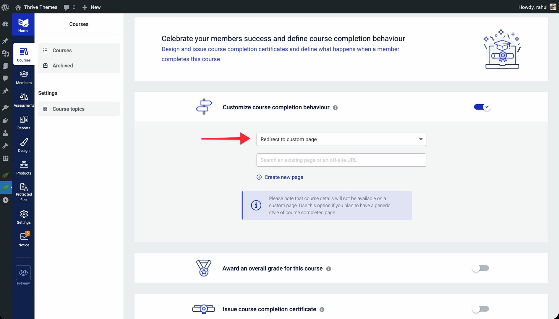 That’s it! You’ve configured course completion behavior in Thrive Apprentice. Students will now be redirected to your chosen destination when they finish the course.