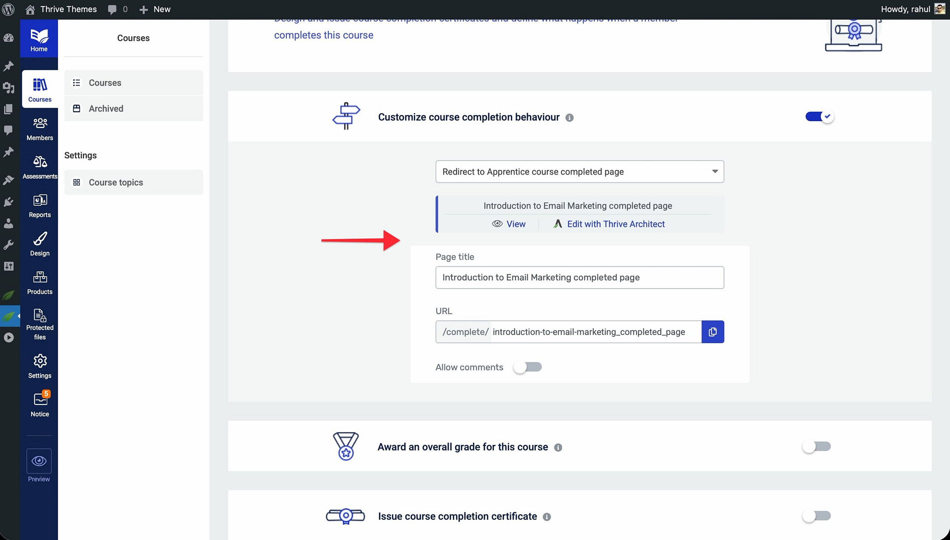 In this article, you’ll learn how to configure what happens when a student completes a course in Thrive Apprentice—including choosing a redirect option, customizing the completion page, and editing it with Thrive Architect.