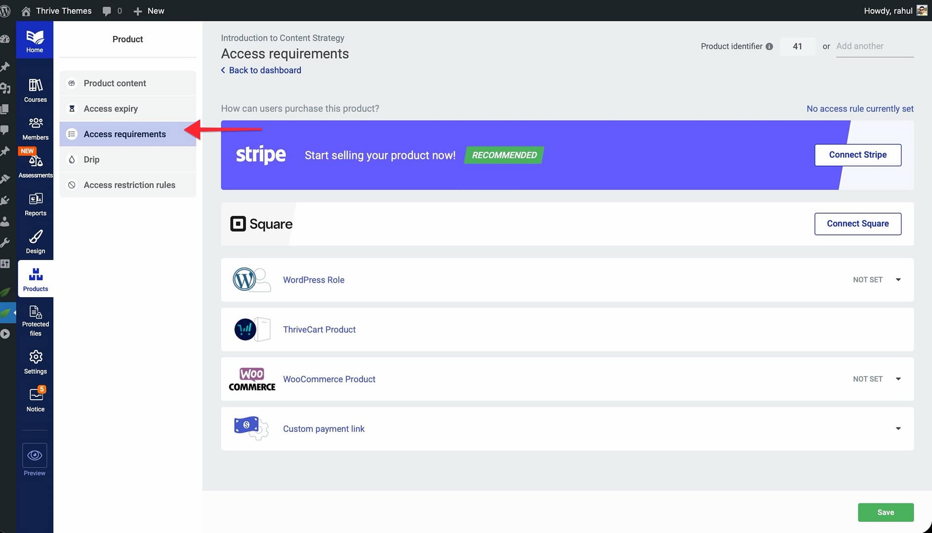You’ll find the Product Identifier on the same Access Requirements tab where you set up the custom payment link. It is displayed at the top of the tab with two fields side by side: