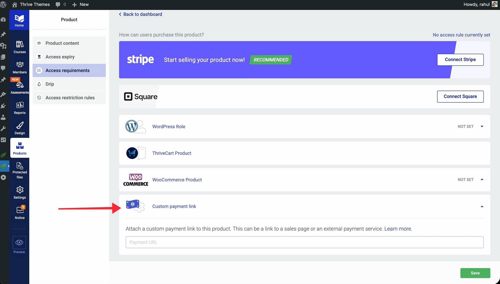 - Under “How can users purchase this product?”, find the Custom payment link integration card and click on it to expand the section.