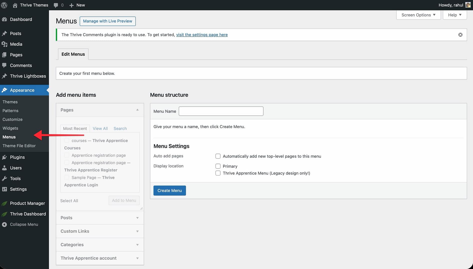 - Scroll down to the Menu Settings section at the bottom of the Menus page.