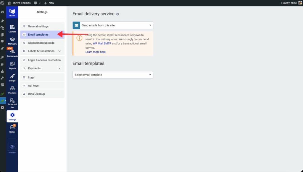 Thrive Apprentice includes five email templates, each triggered by a different event. To edit a template, select it from the Select email template dropdown on the Email Templates settings page.