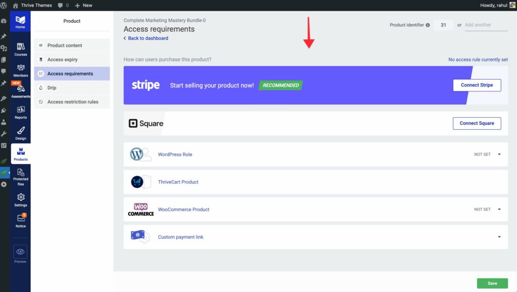 - Connect your payment gateway (e.g., ThriveCart, WooCommerce, or SendOwl) to handle purchases