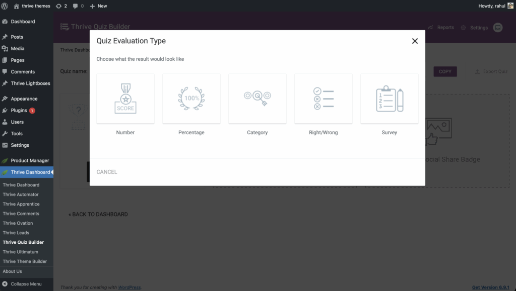 Thrive Quiz Builder offers five ways to evaluate user answers. You can choose your quiz type during the initial setup or change it later from the Quiz Type card on your dashboard.