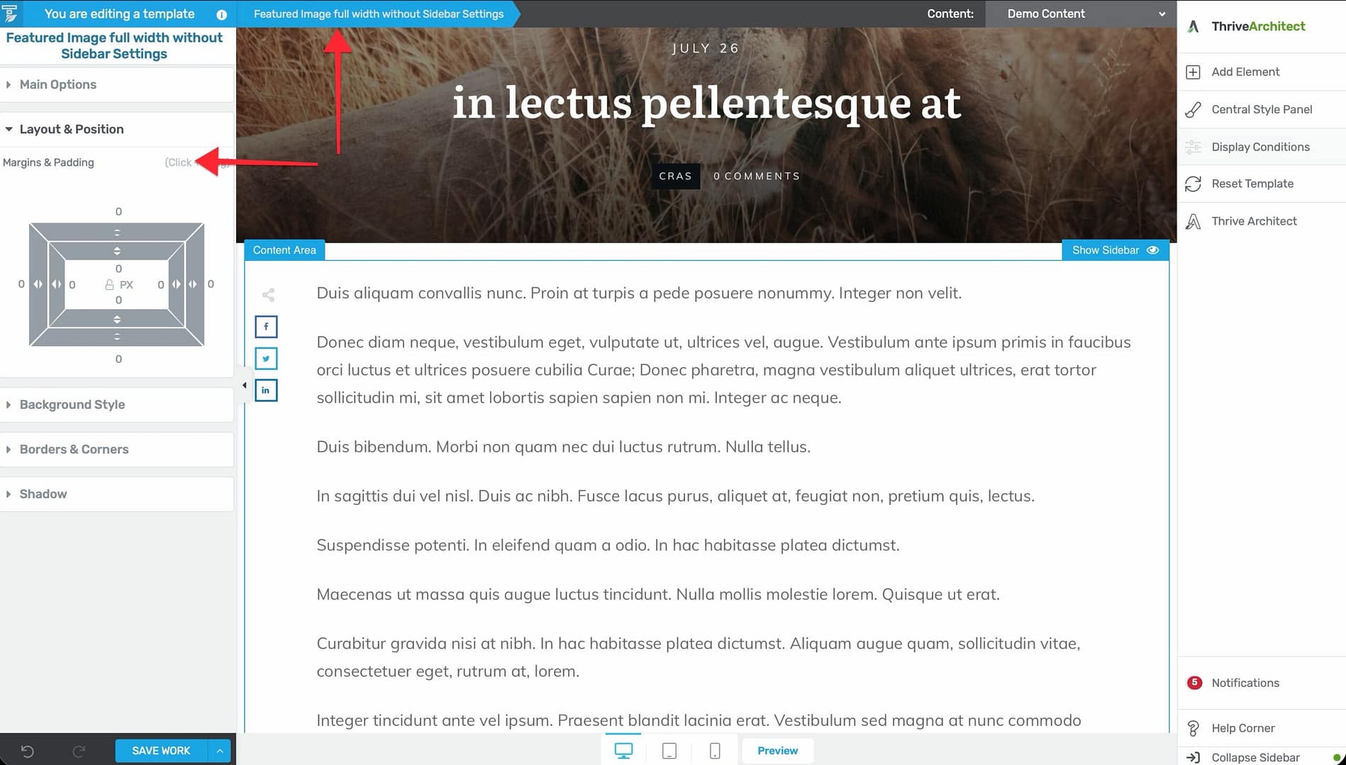 - In the Thrive Theme Builder editor, click the Layout Container label in the breadcrumbs at the top of the editor. You can also click on the outermost background area of the template.