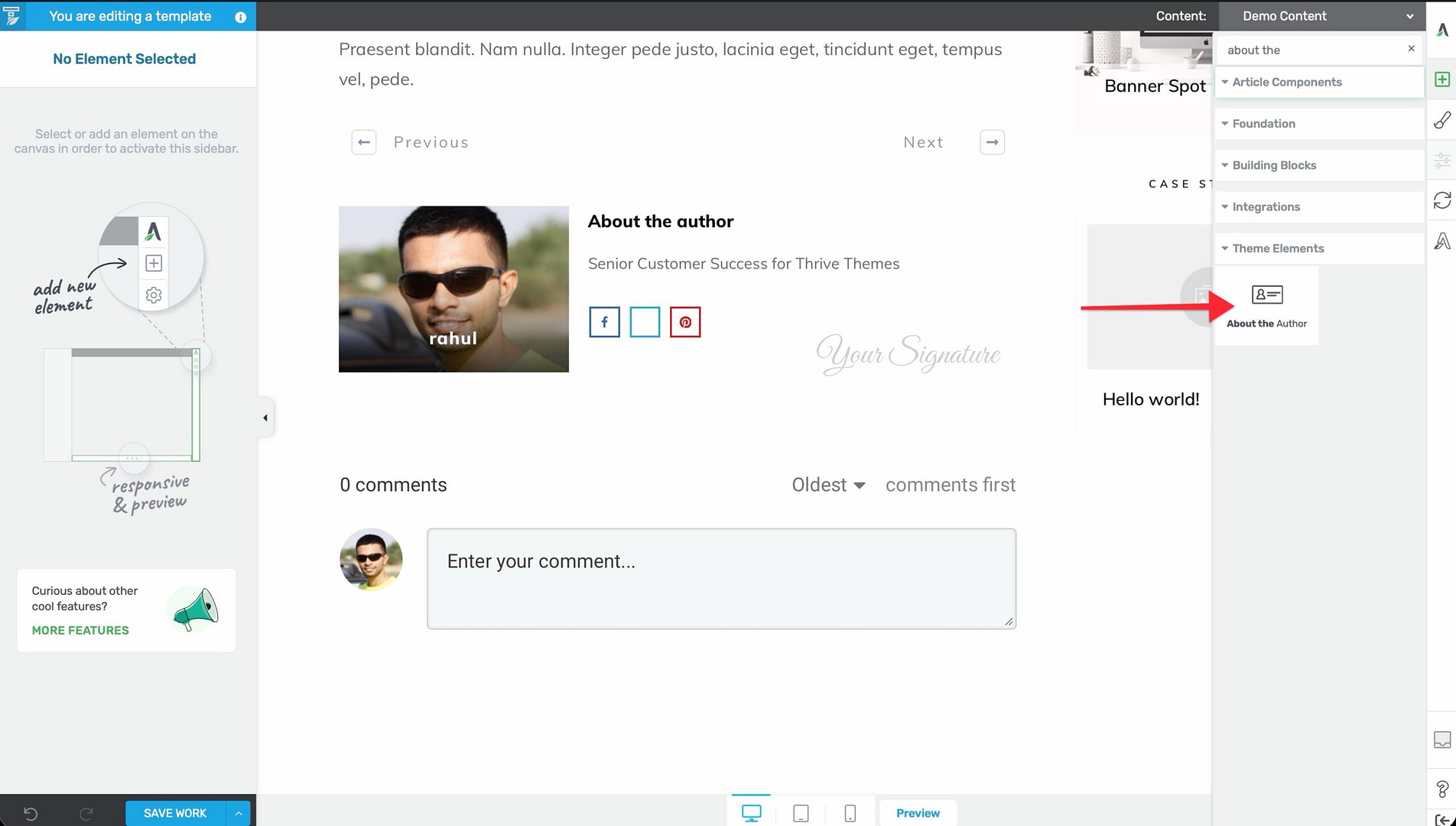 - Drag the element into position on the template (typically below the post content).
