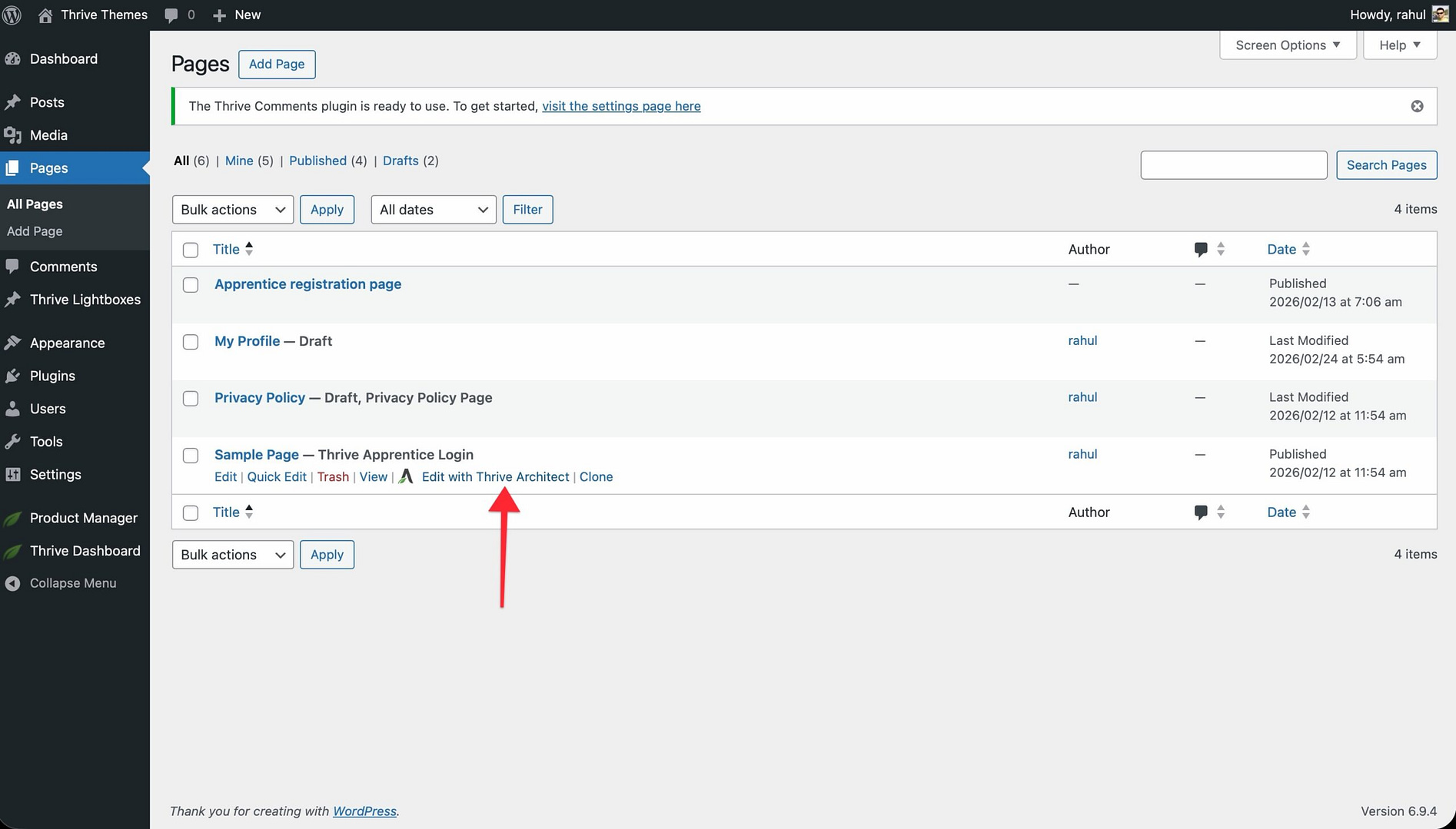 - In the WordPress admin, go to Pages and open the page with Thrive Architect.