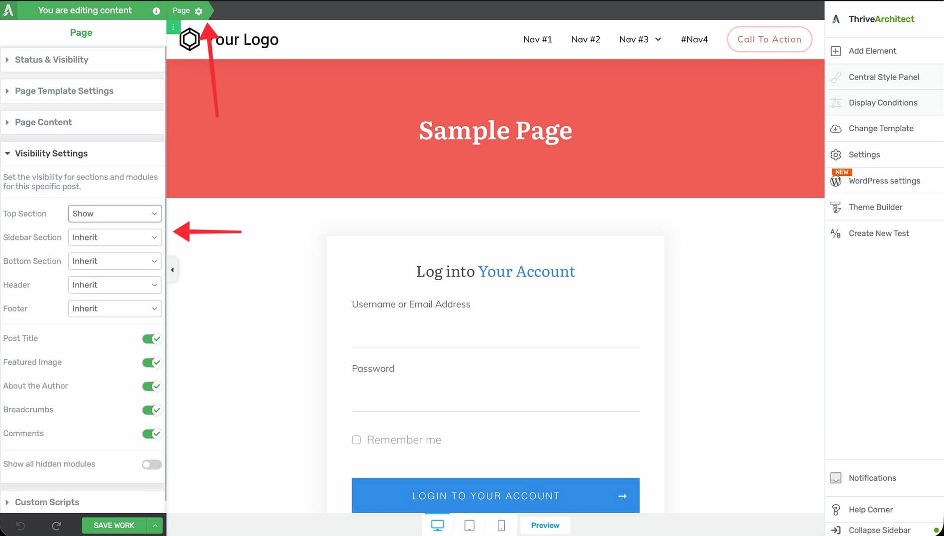 When using a Thrive Theme Builder theme, your pages and landing pages include dedicated Top Section, Bottom Section, Header, and Footer areas. You can control the visibility of each area through the Visibility Settings panel in the Thrive Architect editor. Each section can be set to Show, Hide, or Inherit (from the theme template).