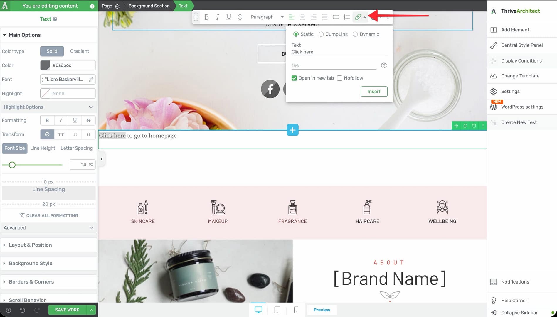 In this article, you’ll learn how to add hyperlinks to text and buttons in Thrive Architect, configure hyperlink settings, apply custom styles and hover effects to individual links, create phone and email links, and build anchor links that jump to specific elements on the same page or a different page.