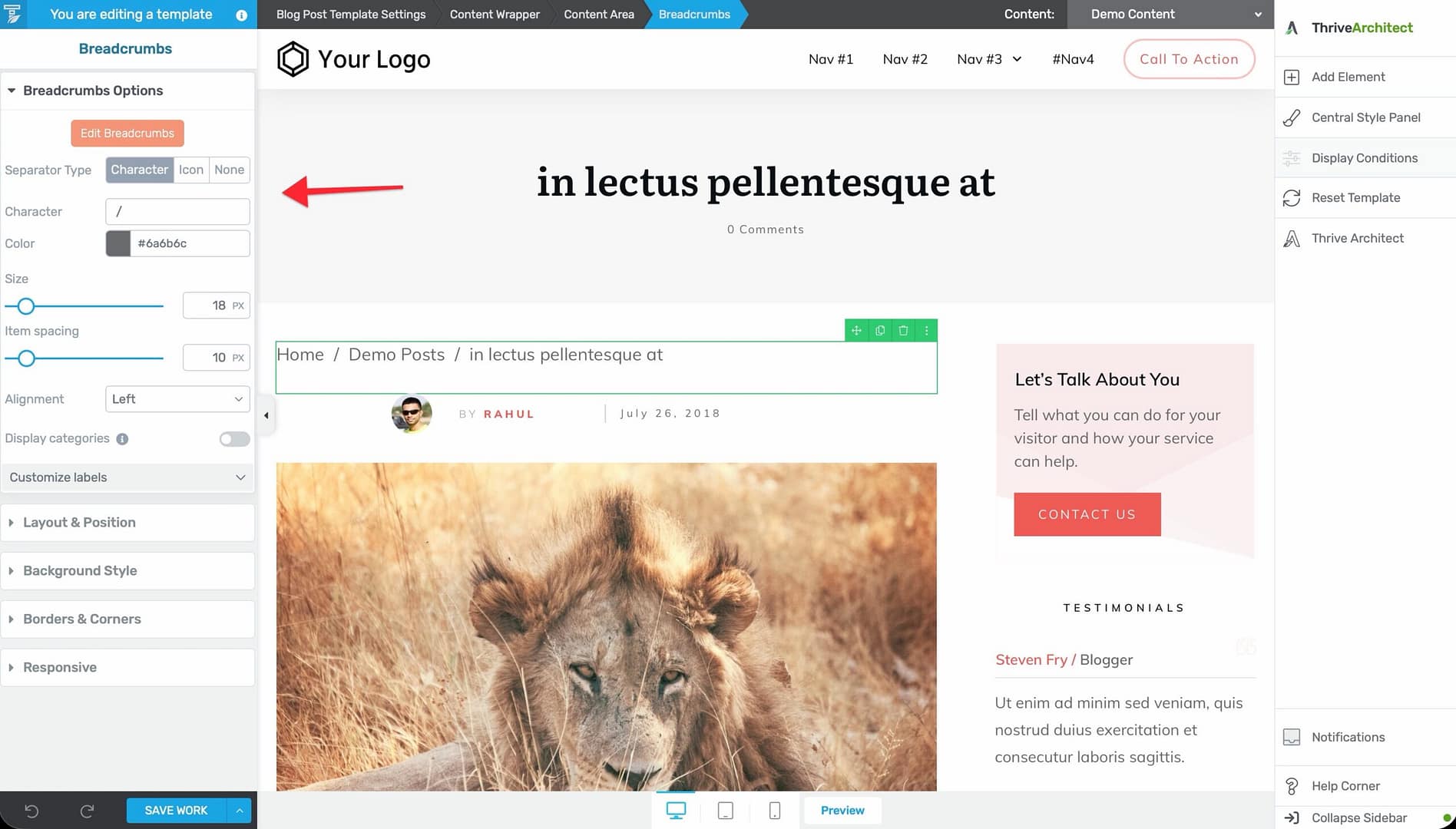 /or>), an icon, or no separator. - Separator Character — Set the character used between breadcrumb items (default: