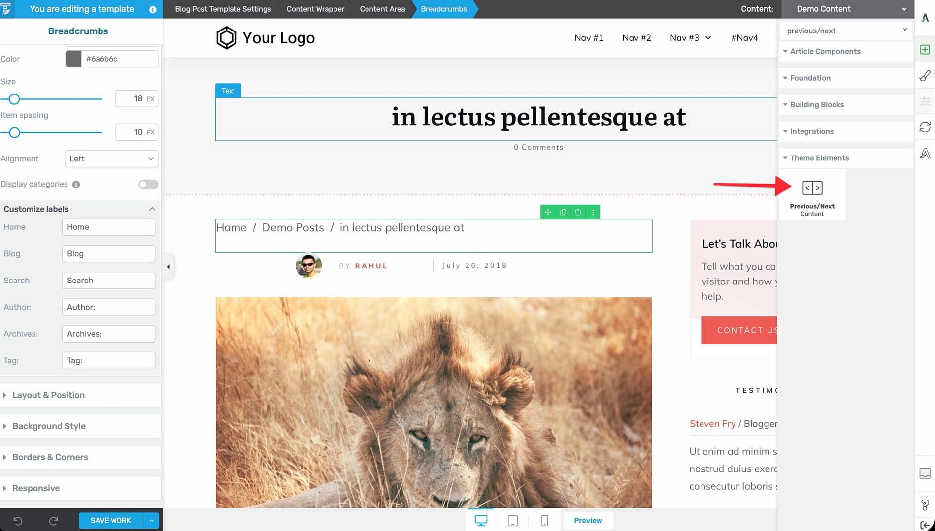 The Previous/Next Content element adds navigation links to move between posts. It displays links to the previous and next posts, helping visitors continue reading related content.
