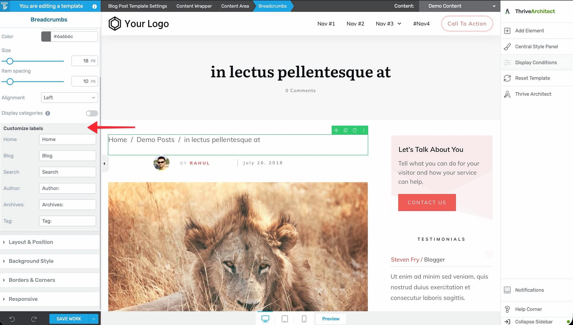 - Open a post template in the Thrive Theme Builder editor.