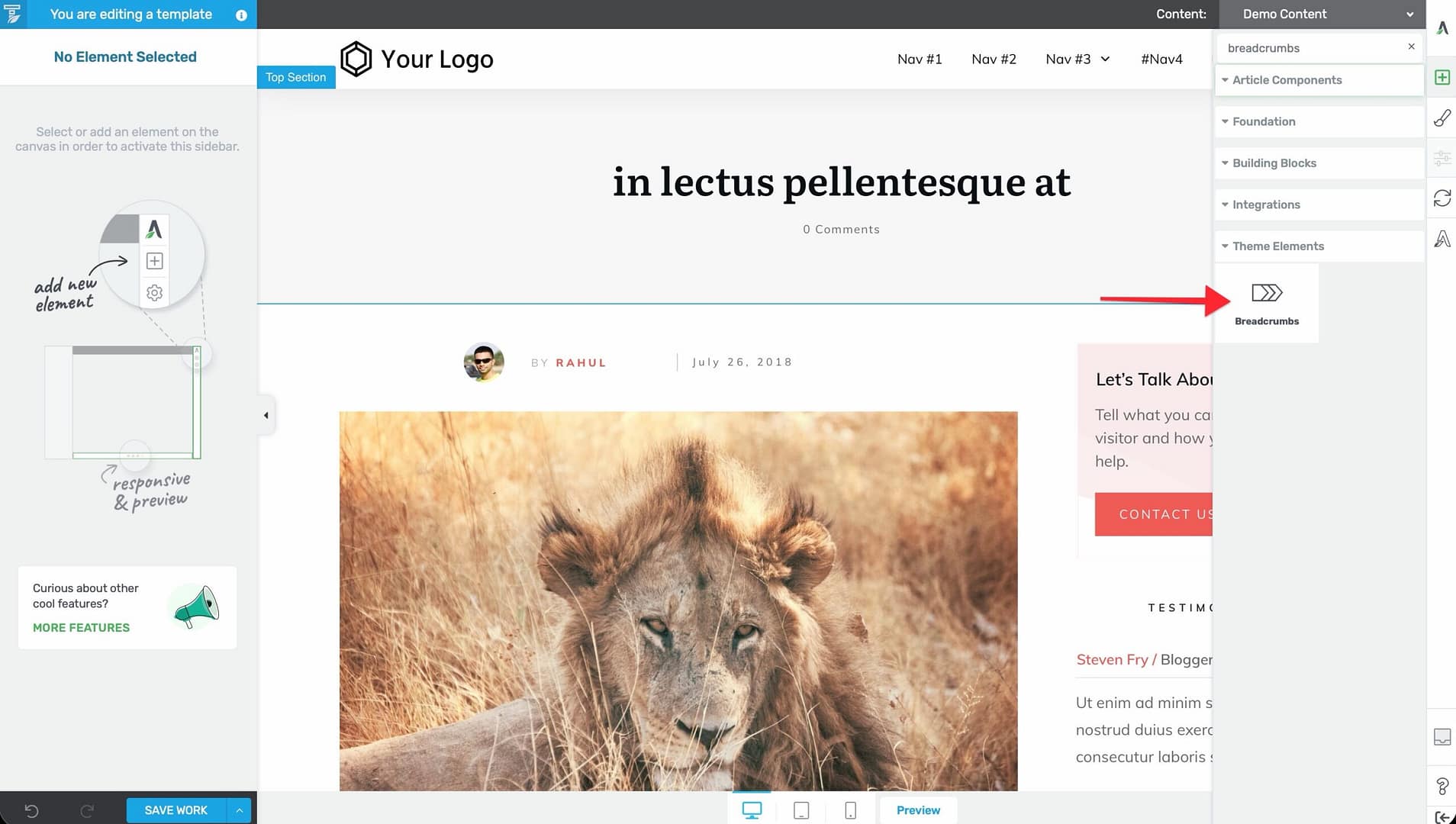 - Drag the element into position (typically near the top of the template, below the header and above the content).
