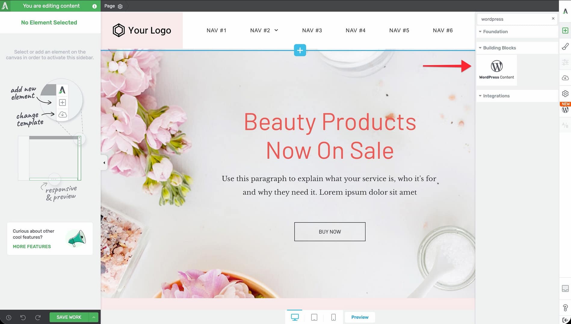 - With the element selected, look at the left sidebar. You’ll see a text area labeled WordPress Content.