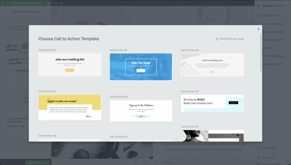 The Call to Action element is a pure template element—it has no hardcoded options of its own. Instead, you select a complete design from the template library, and then edit each sub-element (text, buttons, images, backgrounds) individually using standard Thrive Architect controls.