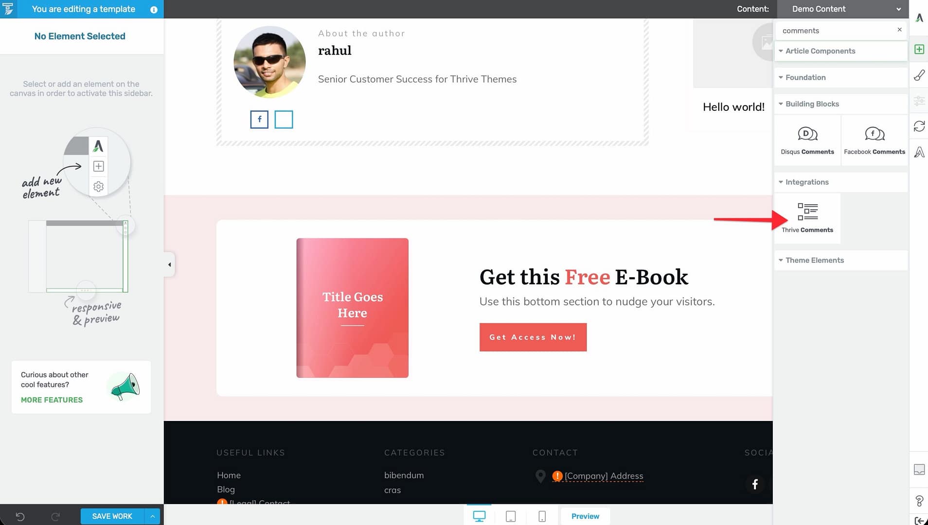 Tip: If the Thrive Comments plugin is active, the element is renamed to Thrive Comments Section in the element panel. It works the same way but includes additional options provided by Thrive Comments.