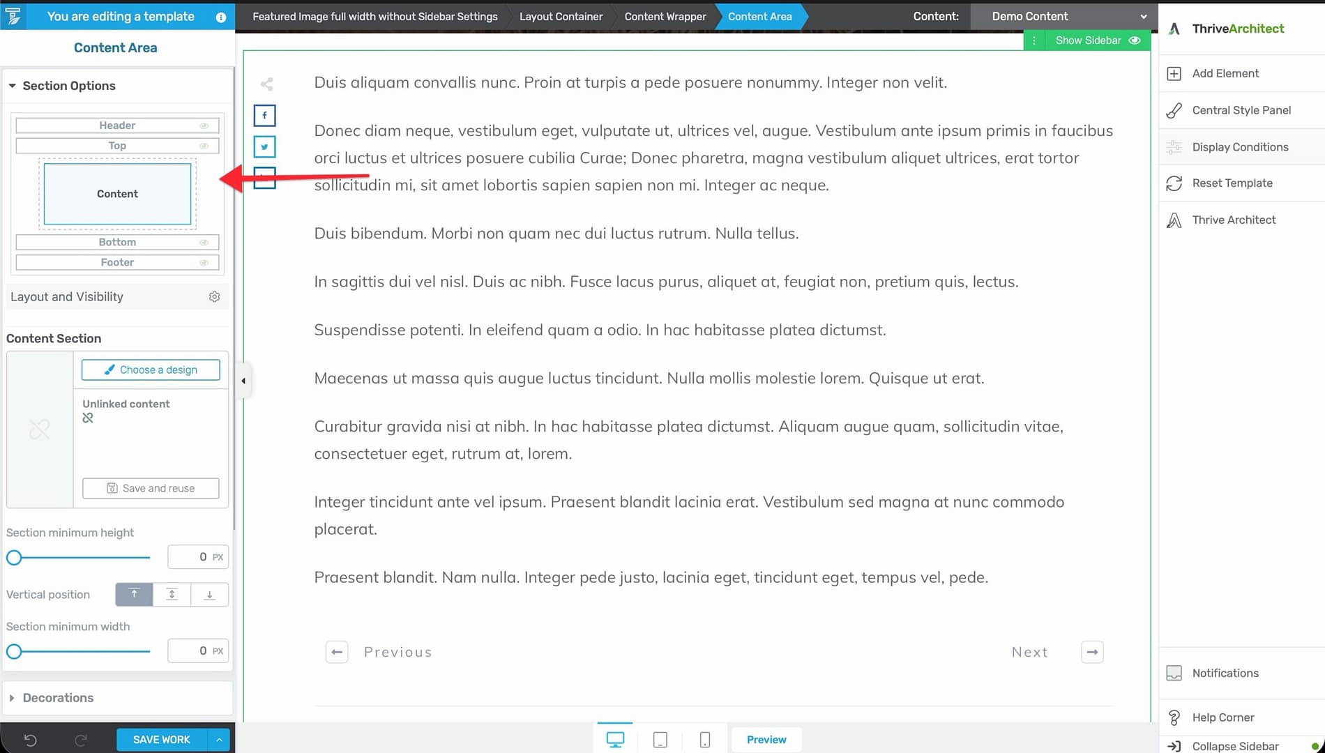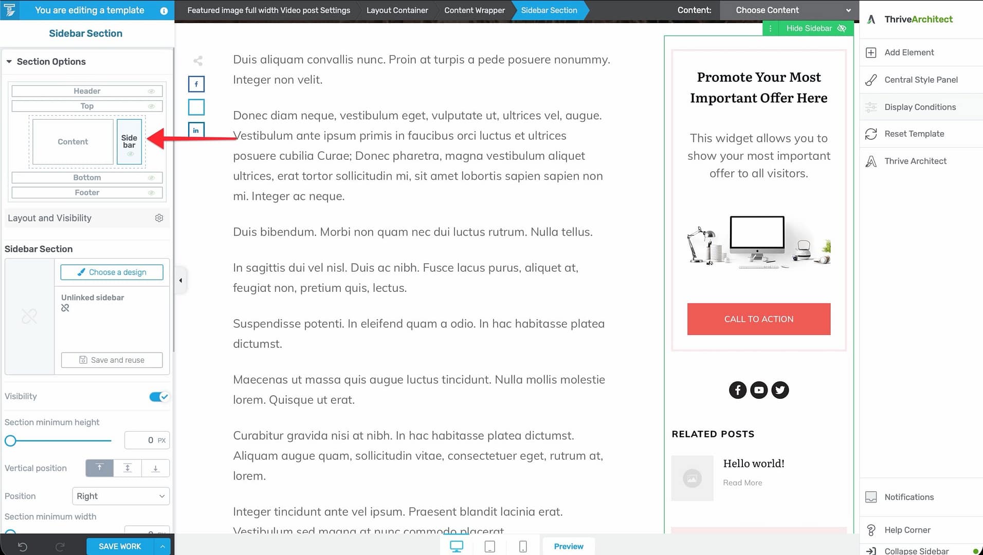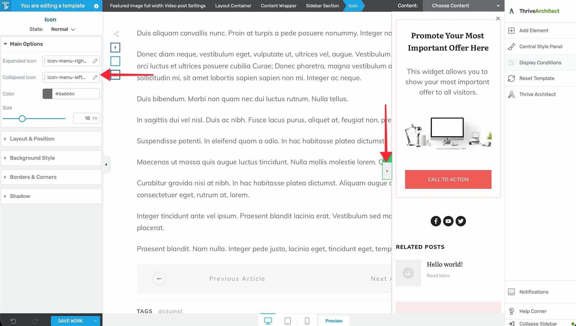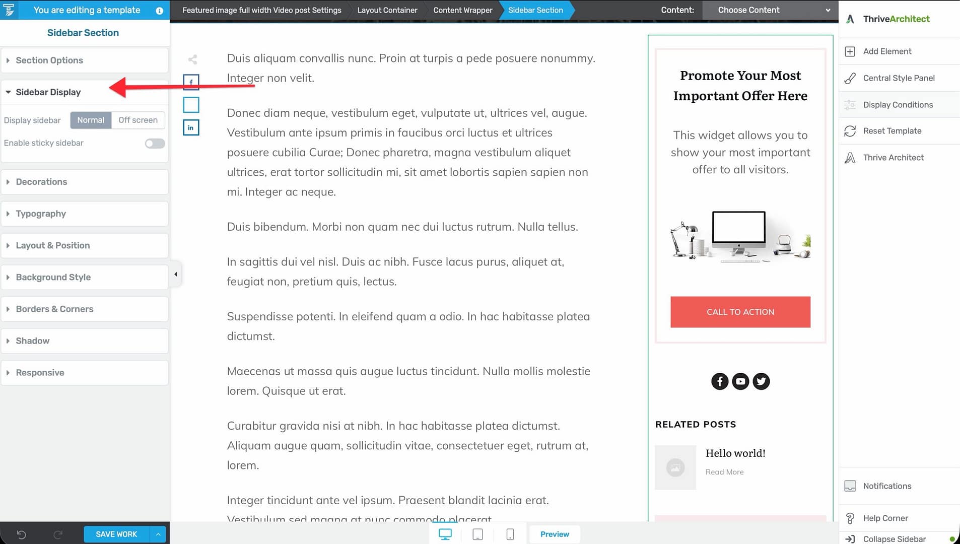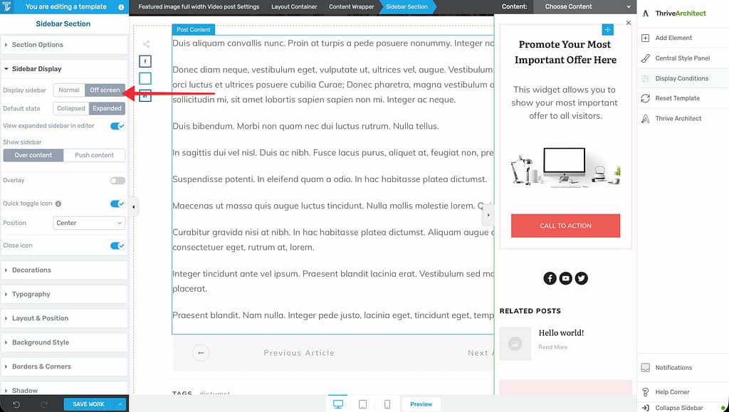 In this article, you’ll learn how to customize the content section, content wrapper, and sidebar section of your Thrive Theme Builder templates—including sidebar display types, off-screen sidebars, and custom triggers.