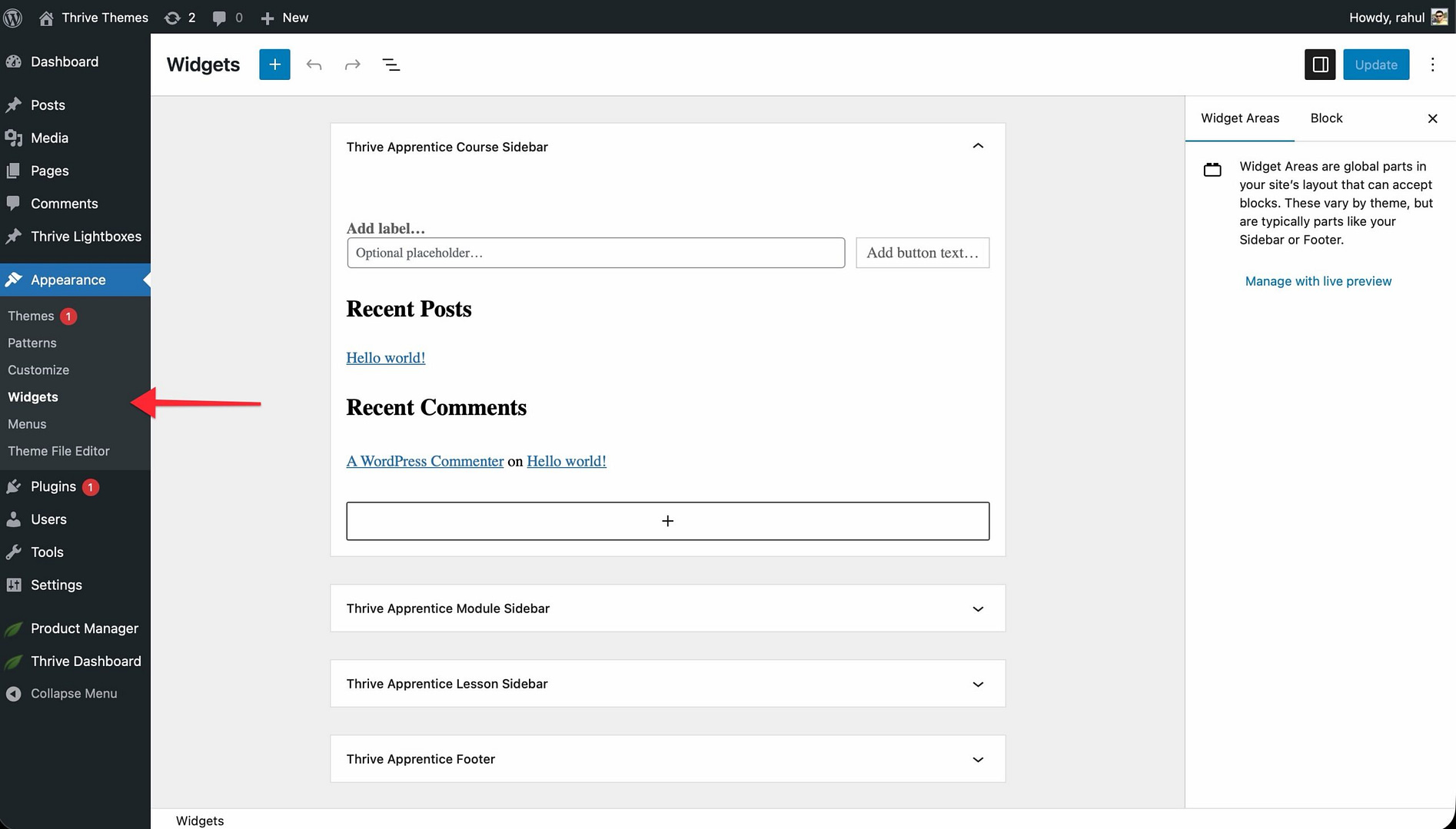 - Configure which WordPress widgets to display through Appearance > Widgets in the WordPress admin.