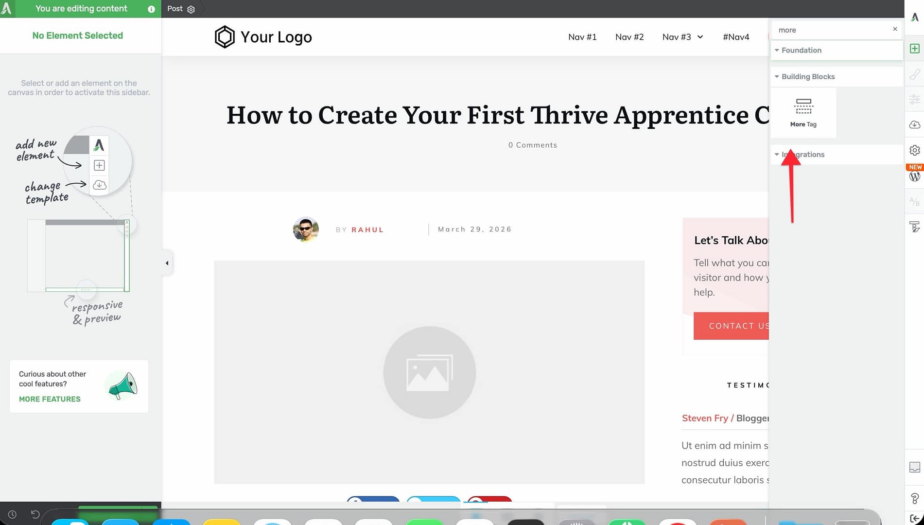 In this article, you’ll learn how to use the More Tag element in Thrive Architect. The More Tag is a WordPress built-in feature that splits your post content into two parts: the excerpt portion (shown on blog and archive pages) and the full content (shown when a visitor clicks through to the individual post). Thrive Architect makes it easy to add this tag visually by dragging and dropping the More Tag element onto your page.