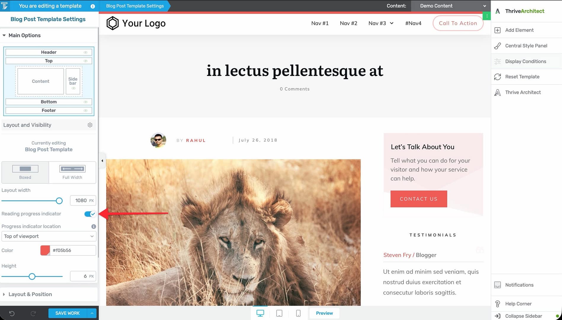 In this article, you’ll learn how to add a reading progress indicator to your Thrive Theme Builder templates—including how to configure its position, appearance, and sticky behavior.