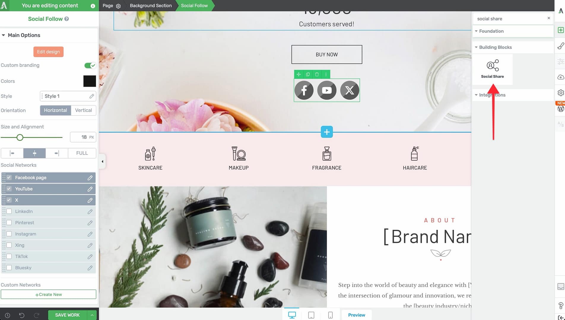 - Alternatively, scroll down to the Building Blocks section in the element list to find the Social Share element.