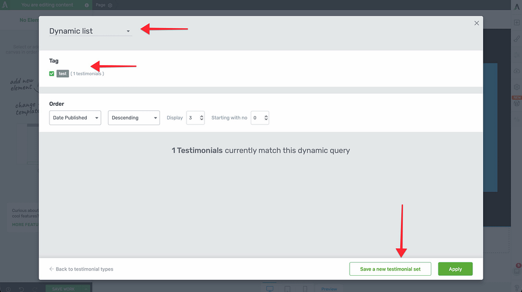 Once your testimonials are tagged, you can display them dynamically using the Display Testimonials element in Thrive Architect.