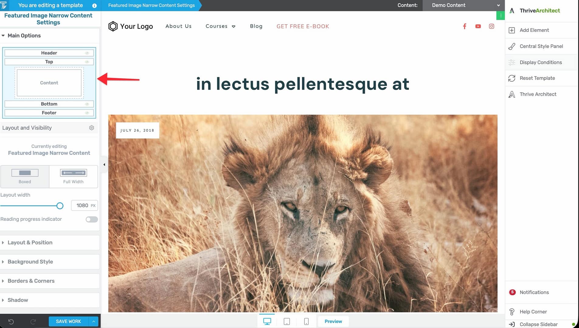 In this article, you’ll learn how to use the Thrive Theme Builder section—the left sidebar area in the template editor where you manage the six main sections of any template: Header, Footer, Top, Bottom, Content, and Sidebar.
