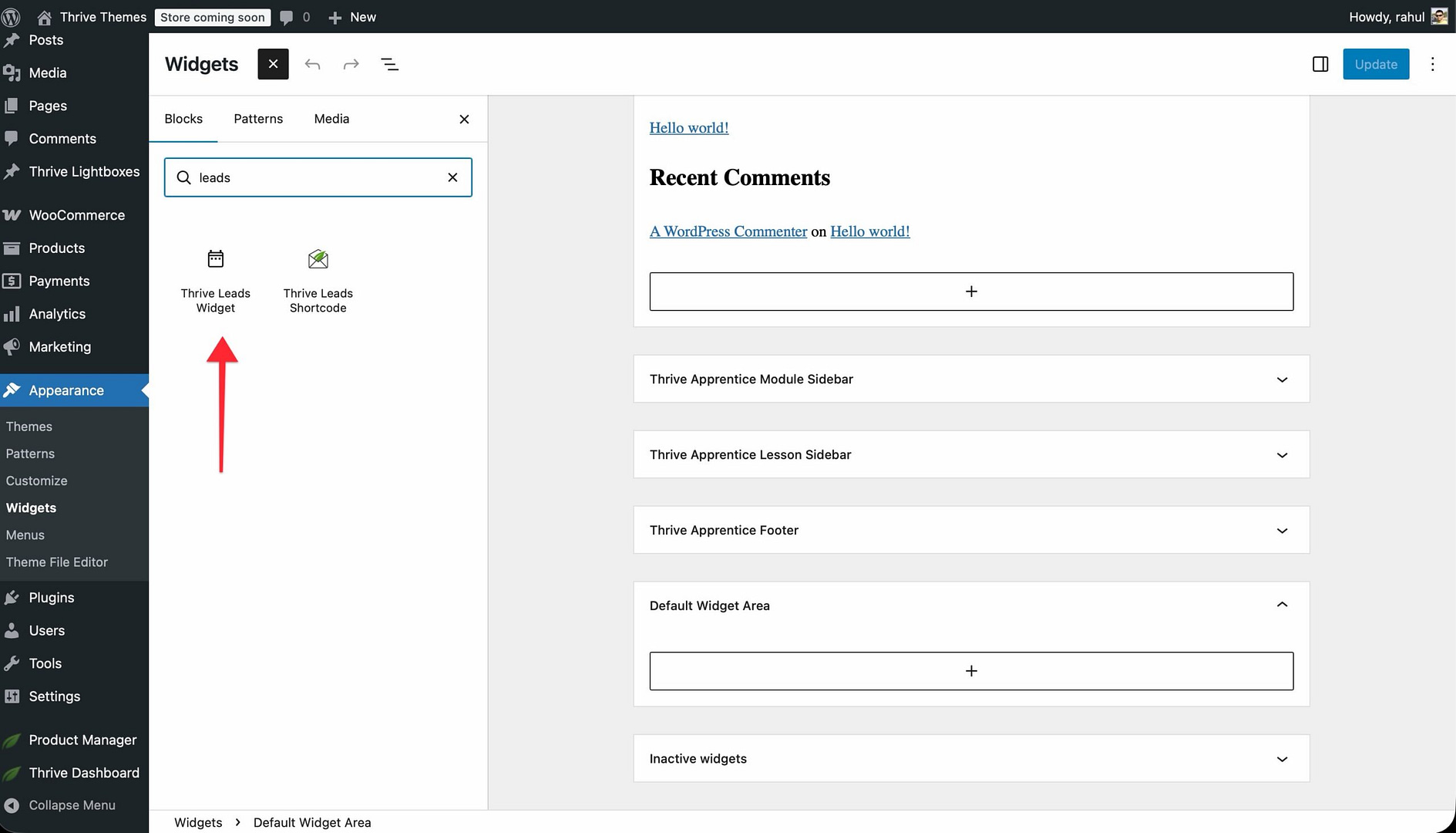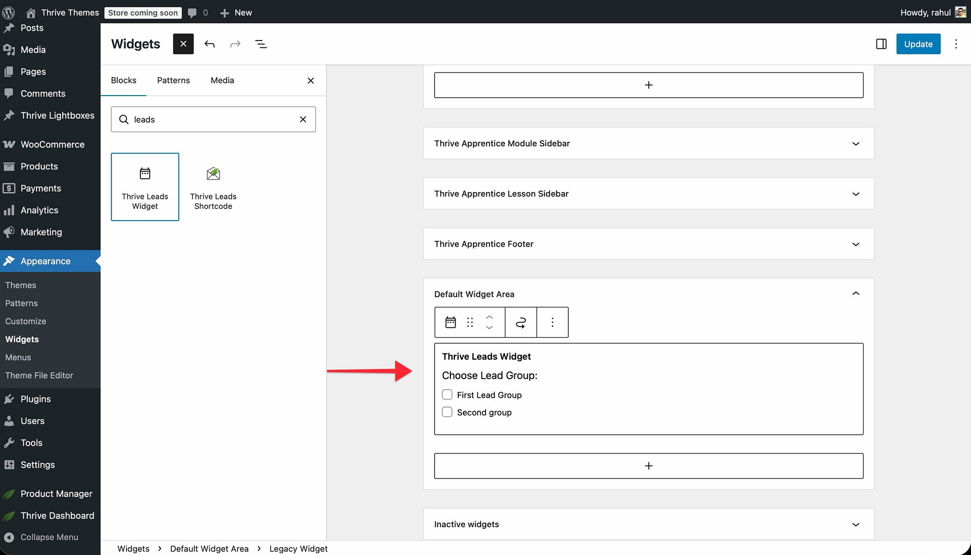 - Add a Thrive Leads Widget to the widget area.