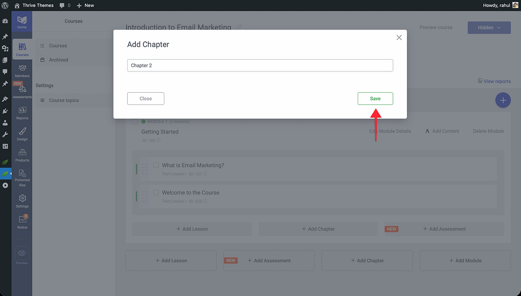The hierarchy works like this: Course > Module > Chapter > Lesson. You don’t have to use all levels—if your course is simple, you can skip modules and organize lessons directly into chapters, or skip chapters entirely and place lessons directly inside modules.