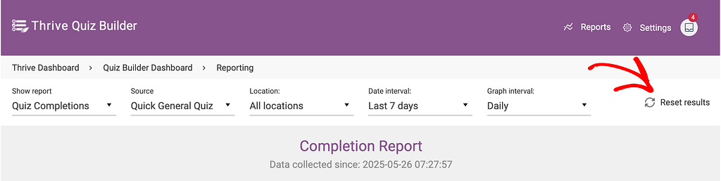 After you have reset the stats, the reporting page of the respective quiz will only display the data that has been collected after the reset.