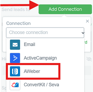 - Next, click Add Connection and choose AWeber from the dropdown list of available integrations.
