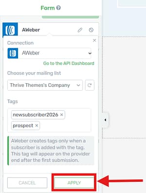 - Once you have selected your list and added your tags, click Apply to save your connection settings.