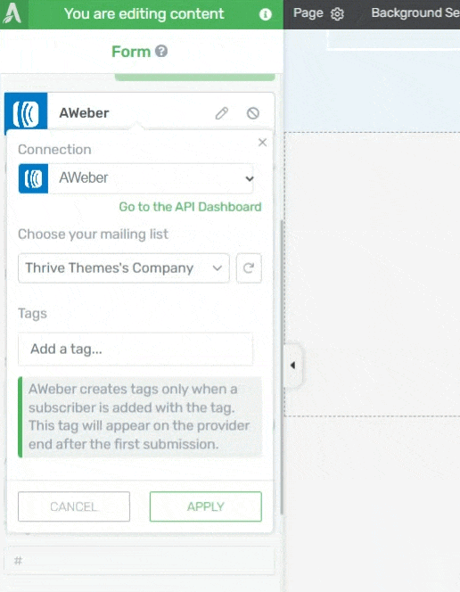 If you are creating a new page or editing an existing one, you can connect AWeber to your form by following these steps: