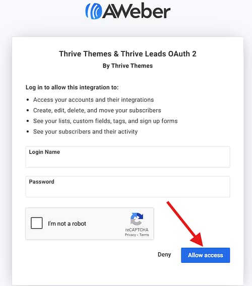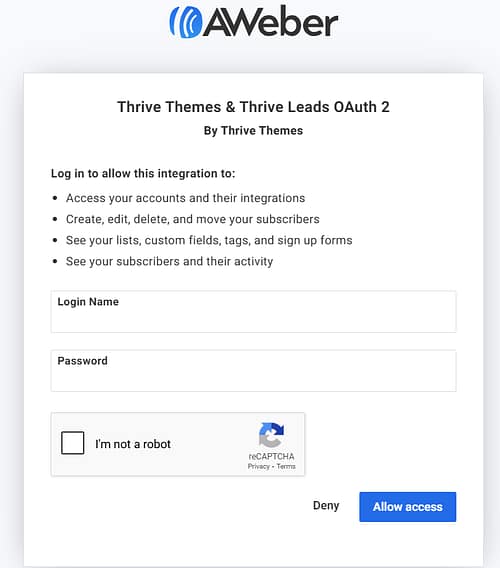 The next step is to authorize Thrive to access your AWeber account using OAuth2. A benefit of the OAuth2 connection is improved security and stability, and you won’t need to manually update API credentials if AWeber changes its authentication system.