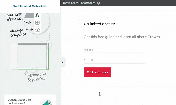- This will open the form in the Thrive Architect editor. From there, click the Lead Generation element in the editor to select it. The element’s options will appear in the left sidebar.