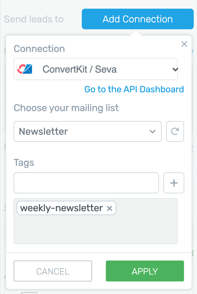 After selecting ConvertKit/Seva, select the list you want to add the leads to and the tags you want to add to them, and click the Apply button.
