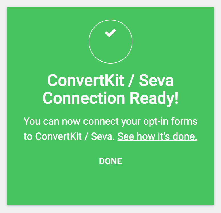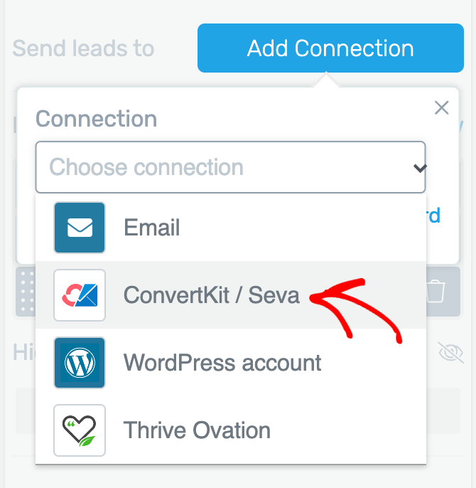 After clicking on Add Connection, you’ll see a dropdown where you select the connection you want to add. In this dropdown, select ConvertKit/Seva.