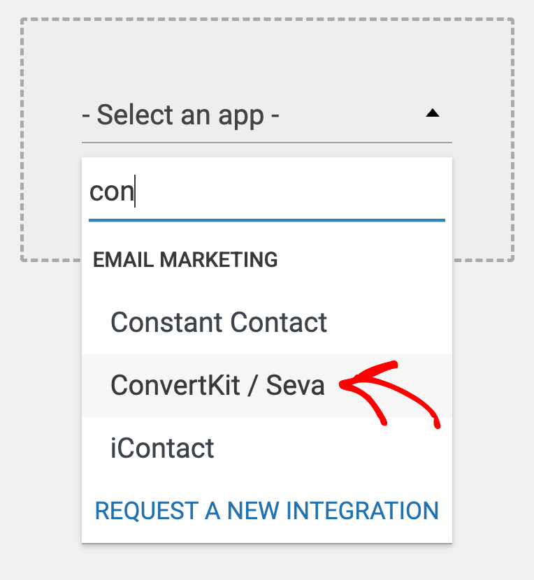 When you click to add a new connection, you’ll see a dropdown where you can select the app, ConvertKit/Seva, that you want to connect to.