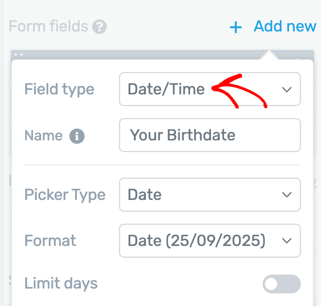 To add a custom field, first under the Form fields section click + Add new.