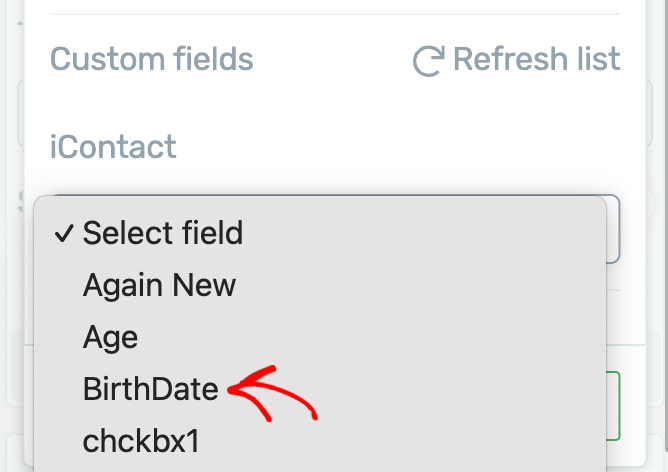 In this example, we’ve selected Birthdate. So, the information going through the Date/Time field will be sent to the Birthdate field in iContact.