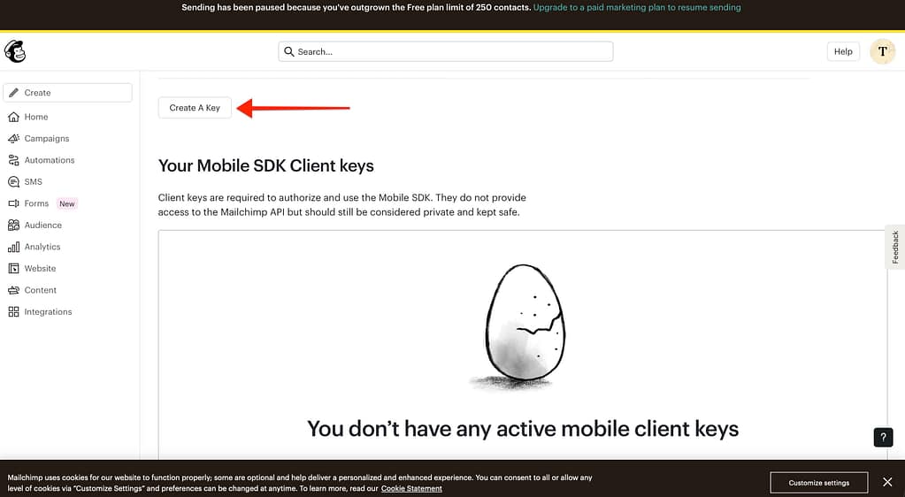 - Scroll down to the API keys section and click Create A Key.