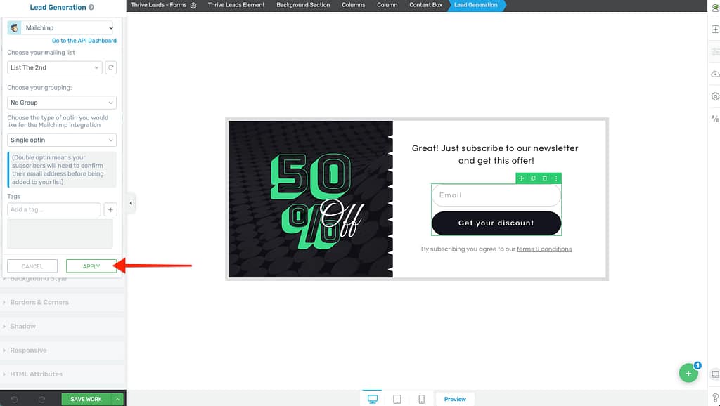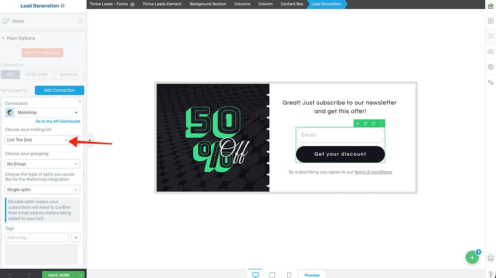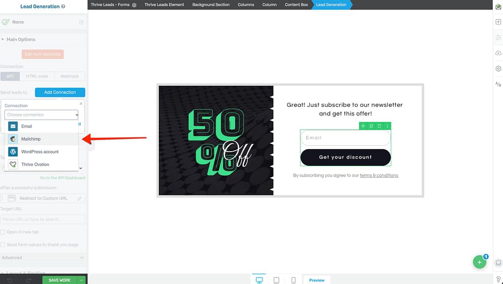 Once connected, you can use Mailchimp with any lead generation form.